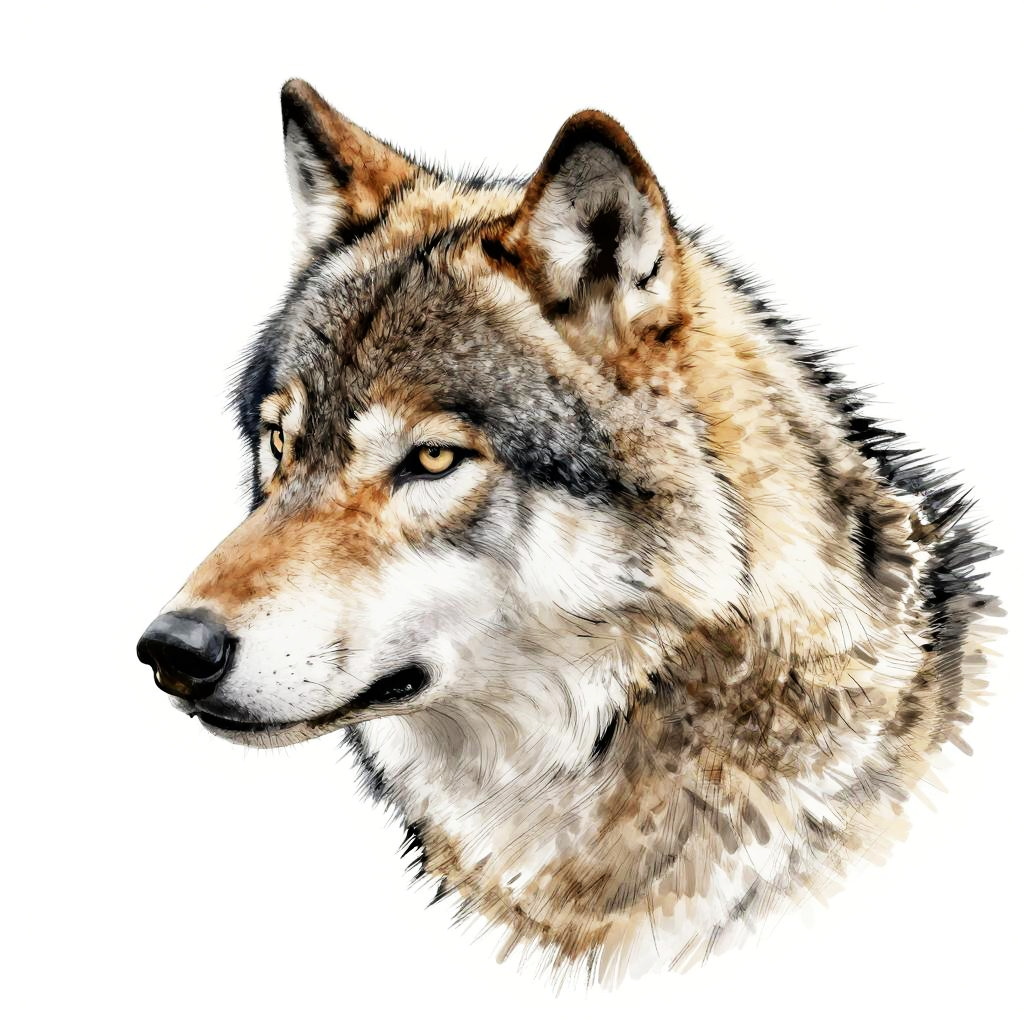 A detailed digital drawing of a wolf's head in profile facing left. The artwork features textured fur with natural shades of black, white, gray, and brown, highlighting the wolf's focused expression. The wolf's ears are pointed, and the eyes are slightly narrowed. The background is plain white, emphasizing the realistic and sketch-like qualities of the drawing.
