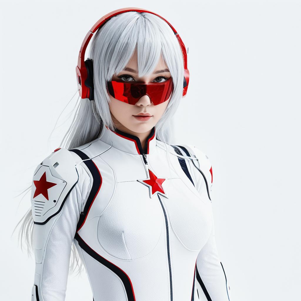 Best quality, highly detailed, masterpiece, ultra-detailed, solo, 1girl, (white background:1.5), (Delicate eyes), plugsuit, star_\(sky\), long_hair, starry_sky, bodysuit, ayanami_rei, night_sky, red_eyes, red_background, breasts, white_bodysuit, eyepatch, pilot_suit, lance_of_longinus, bangs, light_particles, interface_headset, souryuu_asuka_langley