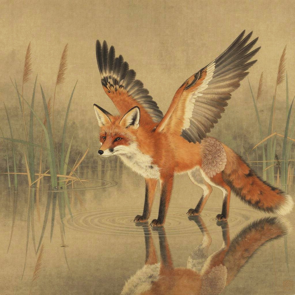 Red fox in still forest pond at dusk, calm water with ripples, full body and clear reflection, wings fully spread, intricate feather detail. Traditional media: traditional hand-ground pigment on mulberry paper. Solo, animal focus, no humans, signature. Natural elements like reeds, balanced symmetry, soft haze, gentle vignette, fine paper texture, painterly strokes, subtle highlights, tranquil composition, serene atmosphere, natural lighting, museum print feel.