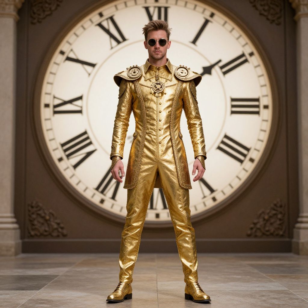 Clockwork Costume, man in a golden outfit standing in front of a clock