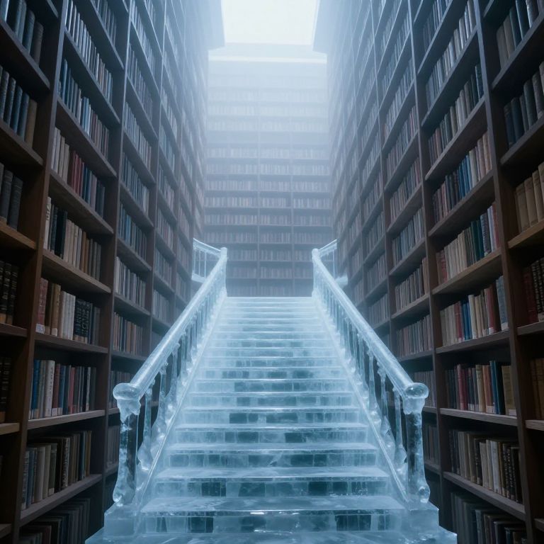 A library of endless shelves shrouded in mist gives way to a staircase of ethereal ice, ascending into a luminous void where knowledge and mystery intertwine.
