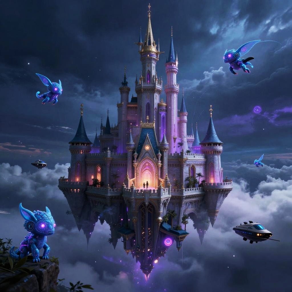 AI fantasy generator depicting a futuristic castle floating above the clouds, surrounded by neon-lit cyber creatures and flying ships, blending fantasy and sci-fi elements with ethereal light effects and a dramatic, moody atmosphere in deep blues and purples.