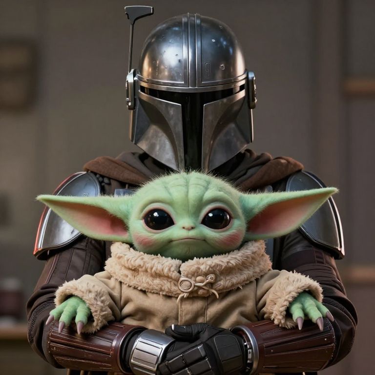 A detailed, photorealistic illustration of Grogu from The Mandalorian, held in the arms of Mandalorian character Din Djarin, with realistic eyes and hands.