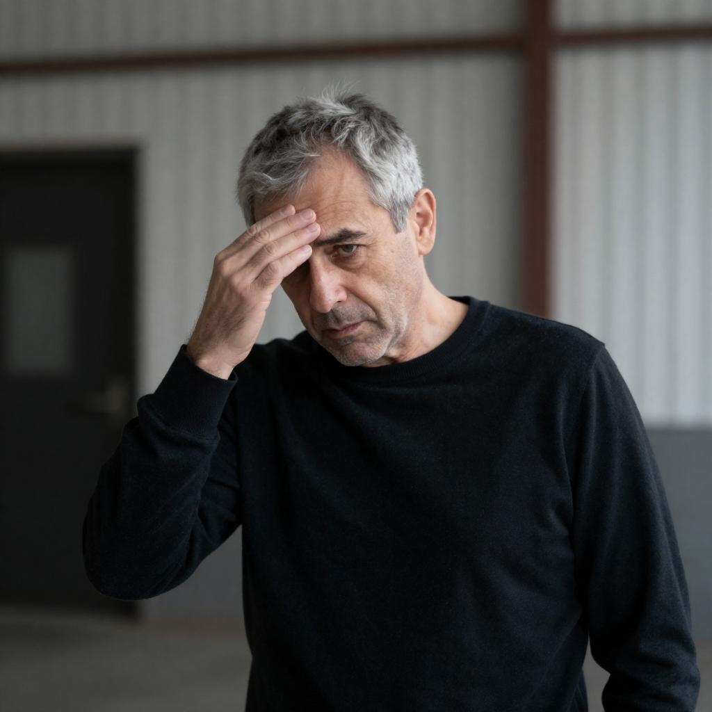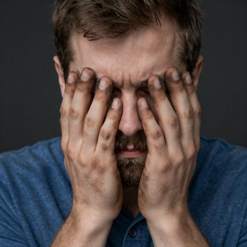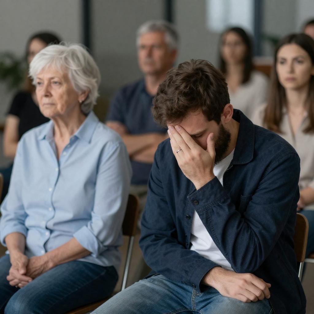 Photograph of a group of people sitting in a row. Foreground: bearded man with short brown hair, wearing blue jacket, white shirt, and ring, covering face with hand. Middle: elderly woman with white hair, light blue shirt. Background: older man with gray hair, woman with dark hair, blurred faces. Setting: indoor, glass walls, dim lighting. Emotions: sadness, frustration. Clothing: casual.