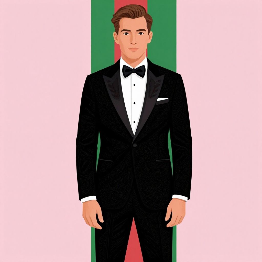 A stylish man dressed in a classic black tuxedo with a bow tie stands confidently against a minimalist pink background accented by vertical green and red stripes. The image features a modern digital illustration style with fine line textures and vibrant colors, emphasizing elegance and sophistication.