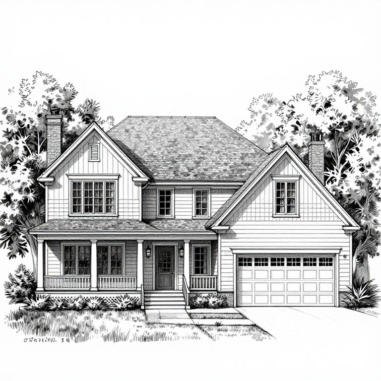 A detailed black-and-white architectural sketch of the Horton Manor Luxury Home 071S-0001, showcasing a traditional two-story house plan with a symmetrical facade, prominent front porch, and garage, rendered in a crisp, hand-drawn style with meticulous attention to texture and shading.