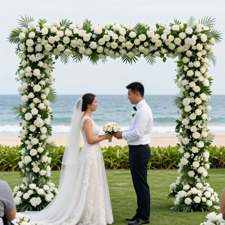 Ceremony unfolds under a floral arch adorned with cascading white roses and greenery, as a bride in a lace wedding gown and groom in a crisp white shirt exchange vows on the beachfront lawn of Shangri La's Rasa Sayang Hotel, with the ocean waves gently lapping in the background.