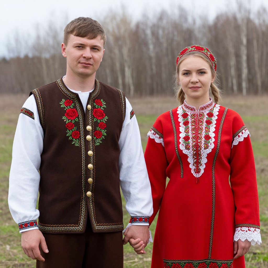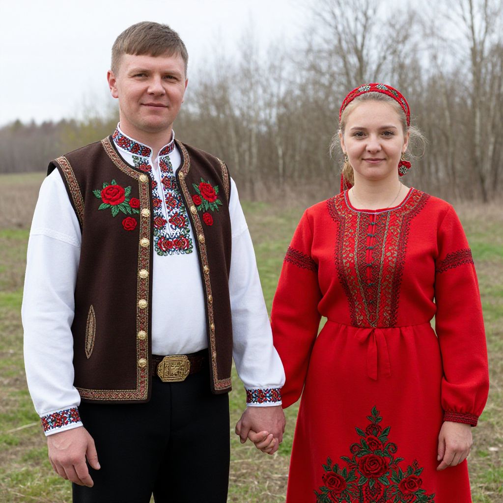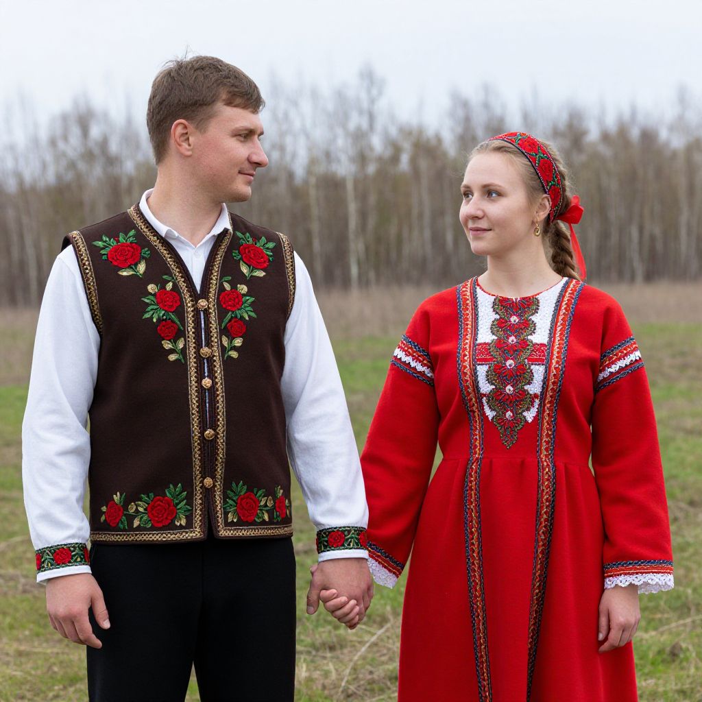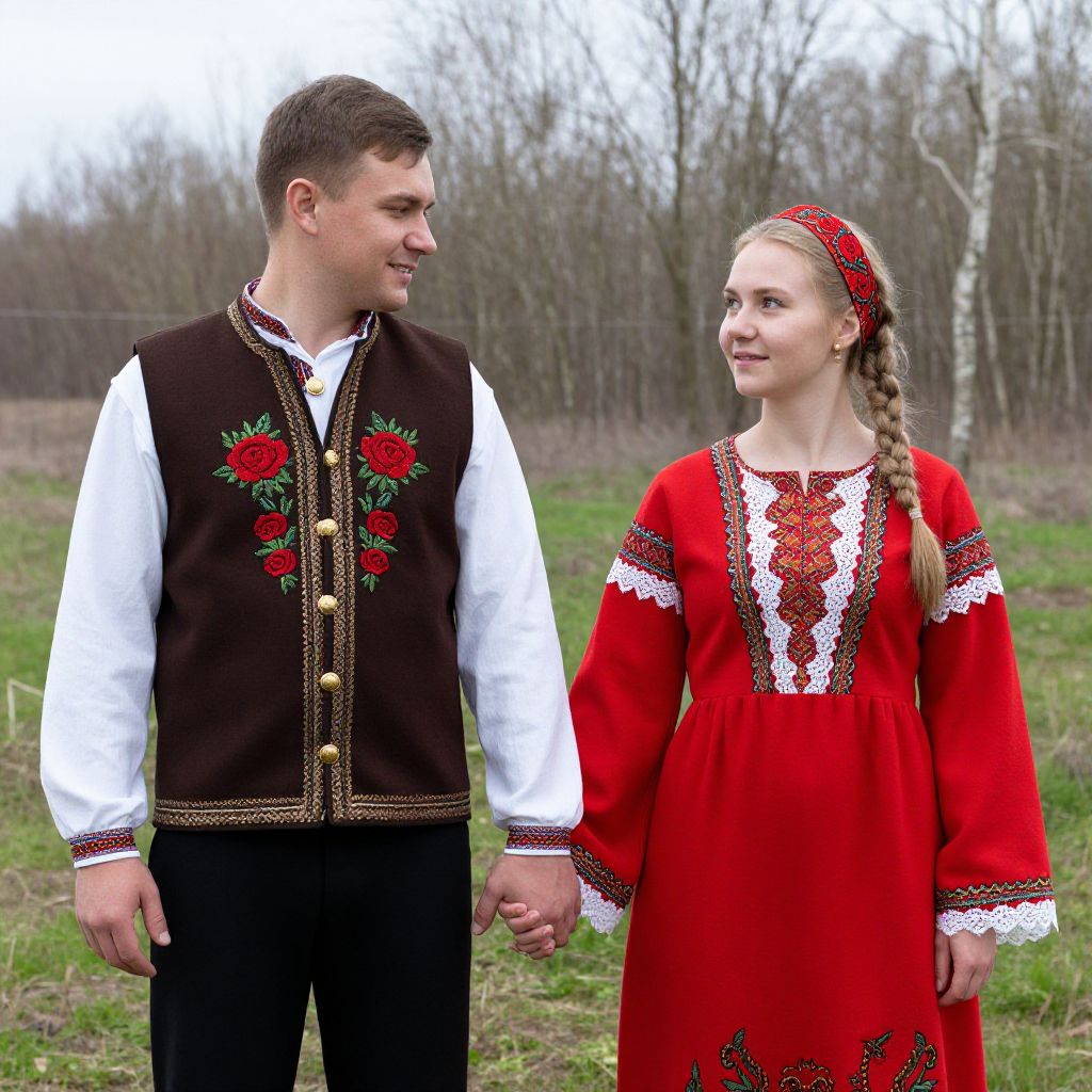 Two individuals dressed in traditional Russian folk costumes stand hand-in-hand outdoors, with the man wearing a brown vest adorned with embroidered red roses and gold buttons over a white shirt, while the woman dons a vibrant red dress with lace detailing and a matching headband, set against a backdrop of a grassy field and bare trees.