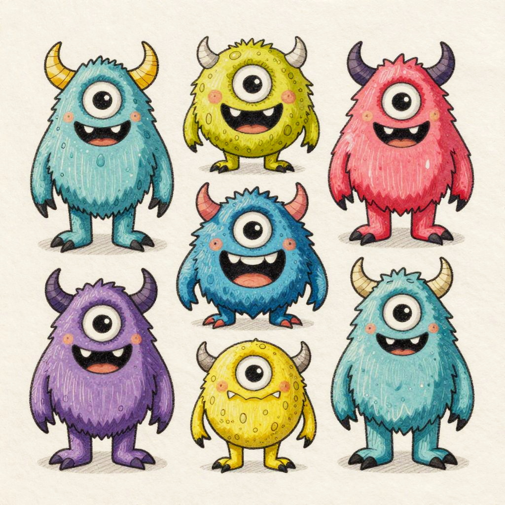 Monster doodle art featuring a whimsical collection of quirky creatures with exaggerated features, vibrant colors, and playful patterns, set on a textured sketchbook background, combining cartoonish charm with surreal details for a lively and imaginative scene.