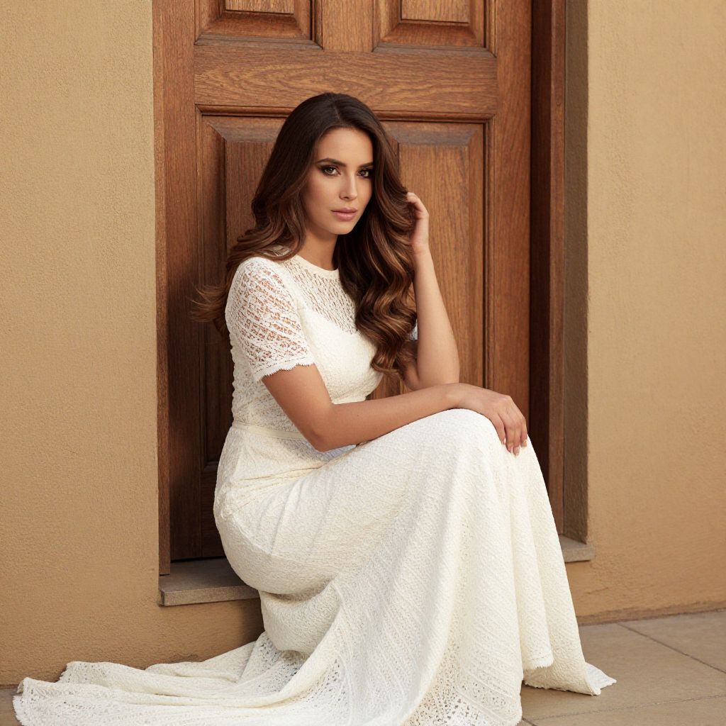 Sitting gracefully against a rustic wooden door, a woman in a delicate white lace dress exudes elegance, her long wavy hair cascading over her shoulders as she rests one hand gently on her knee, surrounded by warm, textured walls.