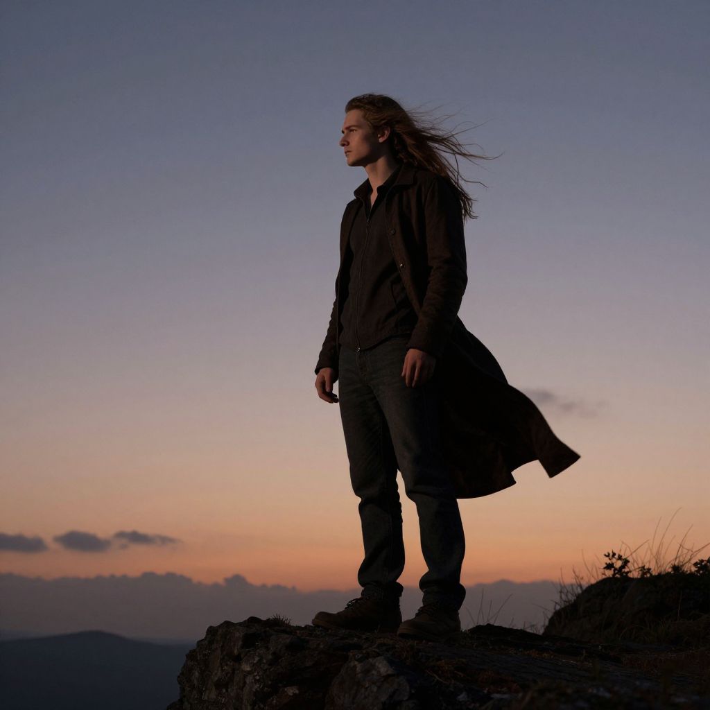 Jacob twilight long hair, a mysterious young man standing on a cliff at dusk, glowing twilight sky, flowing long hair catching the wind, cinematic lighting, detailed portrait
