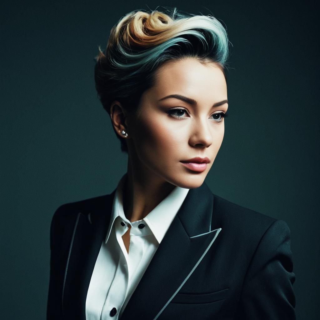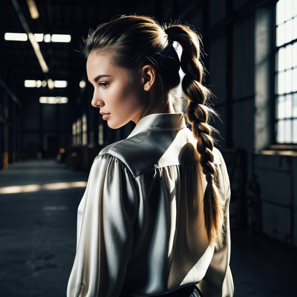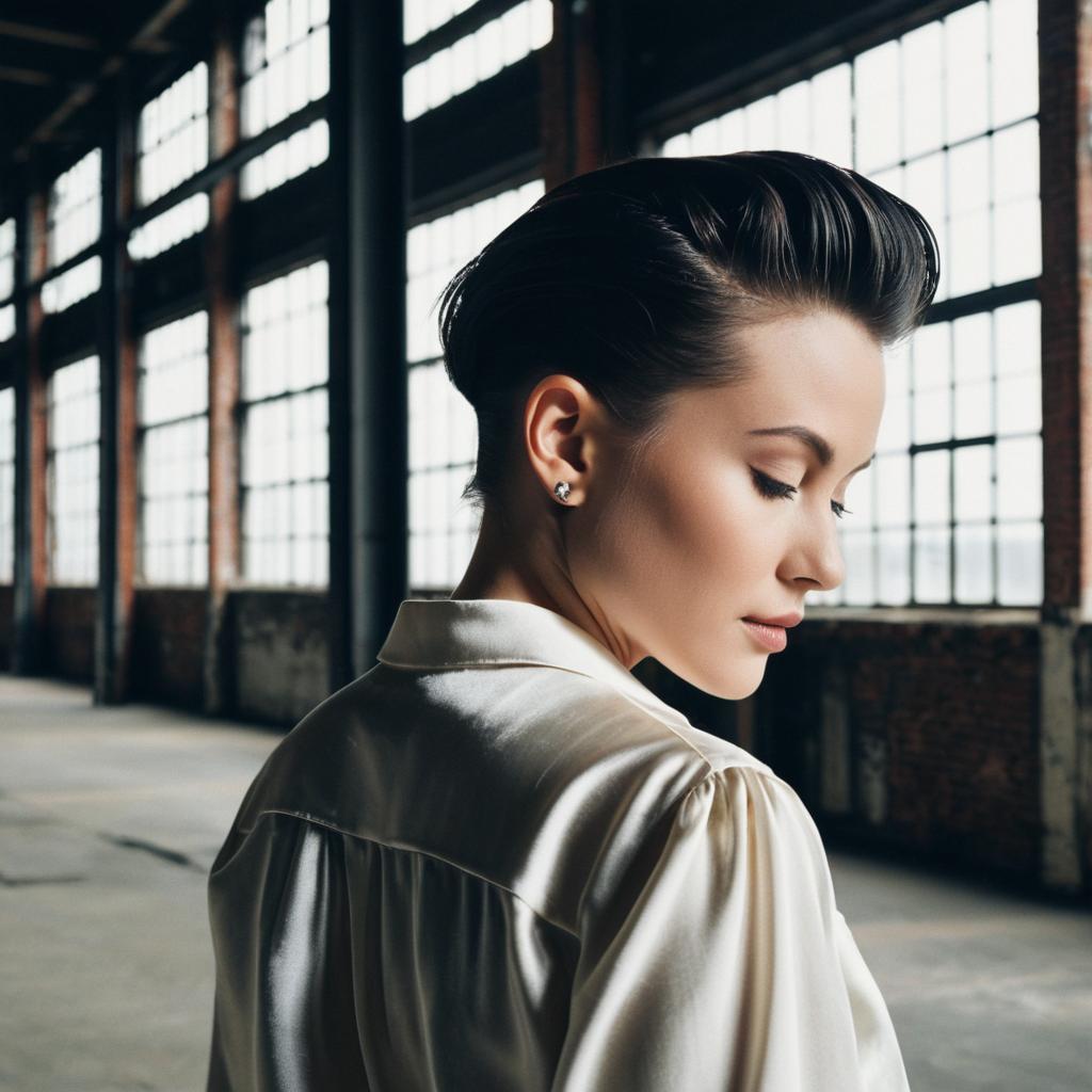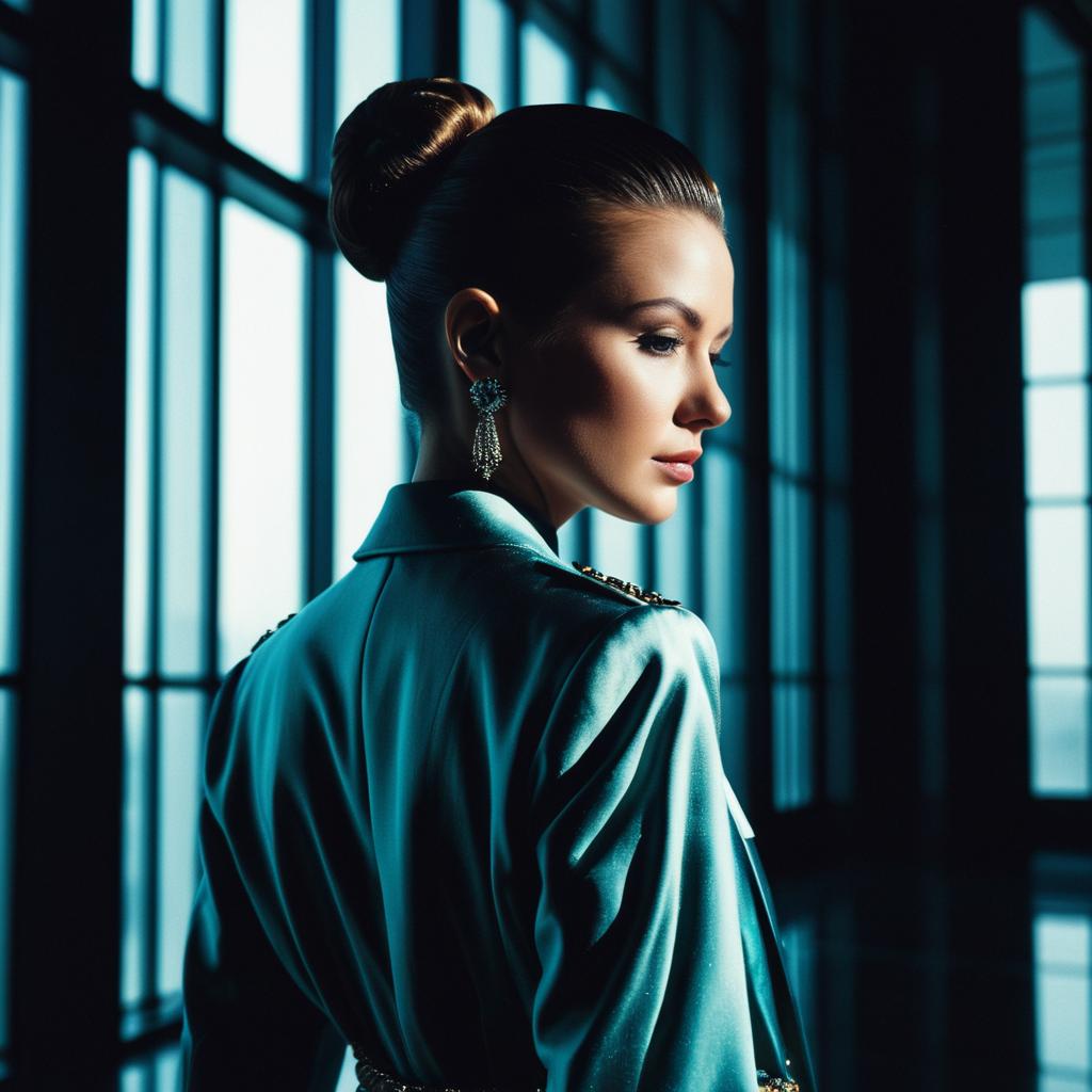 Slick Back hairstyle on woman, wearing luxury outfit, in glass hall, captured in fashion editorial style with dramatic side lighting.