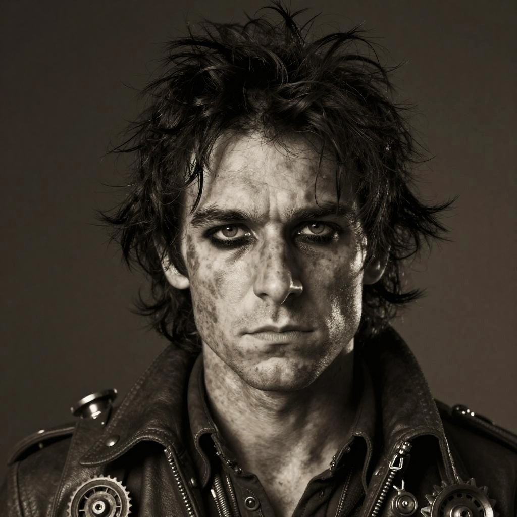 Realistic photo.a sepia-toned portrait of a rugged explorer with messy black hair, pointy nose, round chin, black eyeliner, dynamic and intricate features, hyper-realistic lighting, inspired by Simon Stålenhag, H.R. Giger, steampunk elements, trending on ArtStation realistic photo