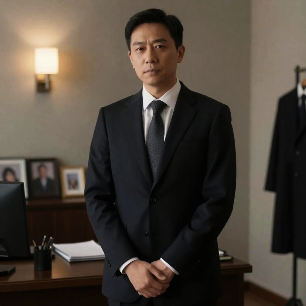 Photograph of an intense-looking middle-aged man with dark hair, wearing a dark suit and tie, leaning forward. Background is blurred with soft light. His furrowed brows and focused gaze convey determination. He is the sole subject.