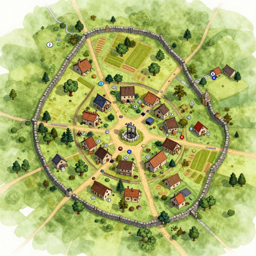 This is a colorful, digital top-down illustration of a small village. The village is surrounded by a circular stone wall and is filled with green fields, trees, and winding dirt paths. Numerous red-roofed houses with white or brown walls are scattered throughout, with a central square featuring a small, gray building. Cars are parked near some houses. The layout includes a mix of residential and agricultural areas, with patches of green fields and neatly arranged trees. The style is vibrant and cartoonish, with bright greens for the fields and darker greens for the trees, creating a lively and picturesque rural scene.