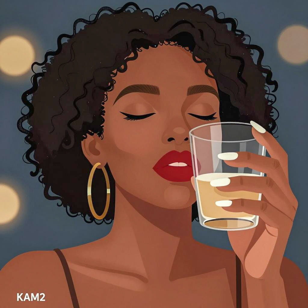 Digital illustration of a black woman with dark skin, closed eyes, and red lips. She has large hoop earrings, white nail polish, and curly hair. She holds a glass close to her face. Background has a bokeh effect with blue and gold lights. Her expression is calm and content. Artist's "KAM2" is in the bottom left corner.