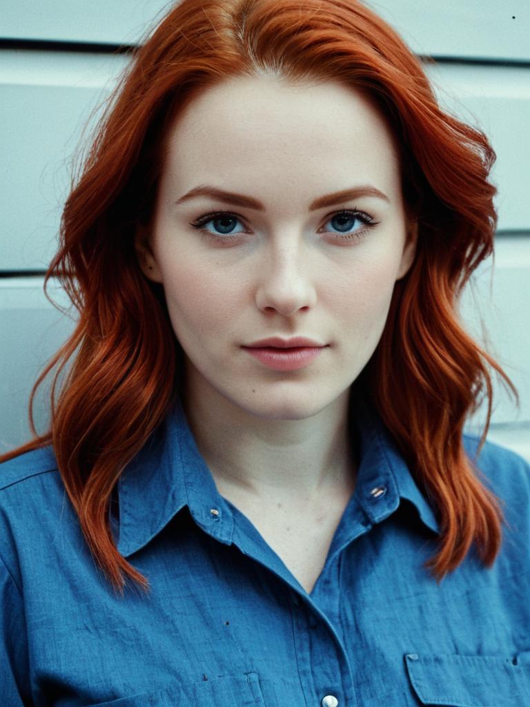 Woman Summer Work Clothes, woman with red hair and blue shirt looking at camera