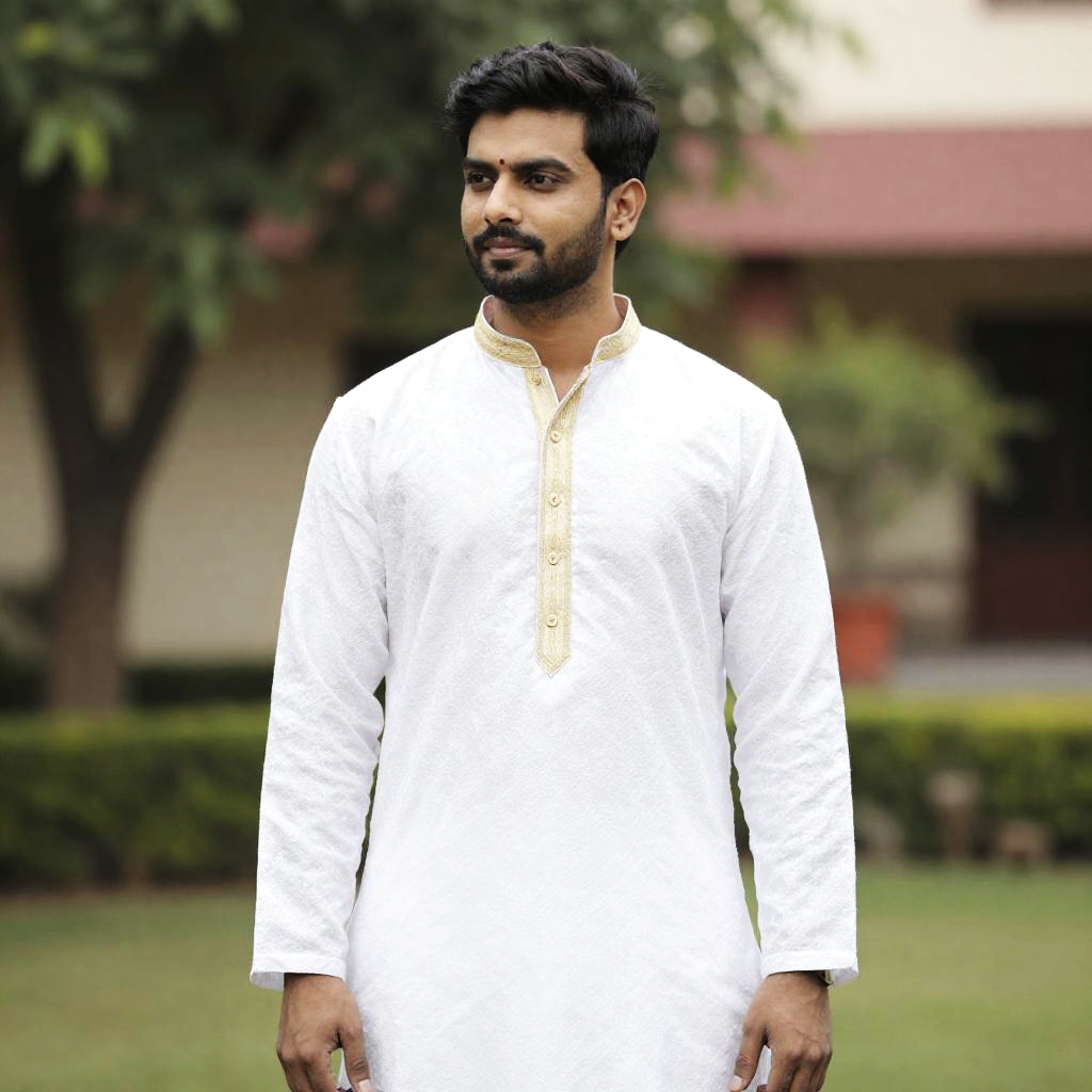 Trending Man Kurta, a man in a white and gold kurta stands in a garden