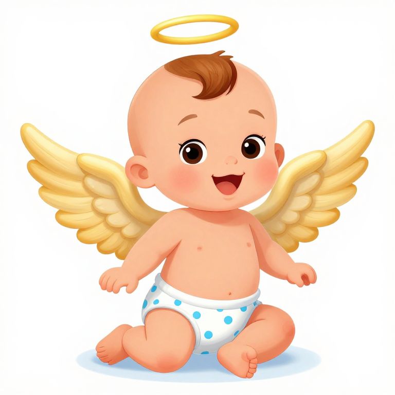 Digital illustration of a chubby, Caucasian baby with a bald head, light brown tuft of hair, and large brown eyes. The baby has a bright smile, a yellow halo above its head, and small yellow wings on its back. The baby is wearing a white diaper with blue polka dots and is sitting with legs bent and arms slightly raised. The background is plain white, making the baby the focal point. The style is cute and cartoonish with smooth, vibrant colors and soft shading.