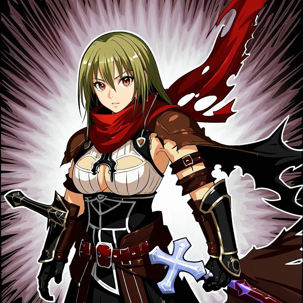 Assassin cross (ragnarok online), ragnarok online, 1girl, hair between eyes, red eyes, long hair, medium breasts, large breasts, red scarf, torn scarf, elbow gloves, waist cape, torn cape, black cape, vambraces, pauldrons, by artist gayarou, anime