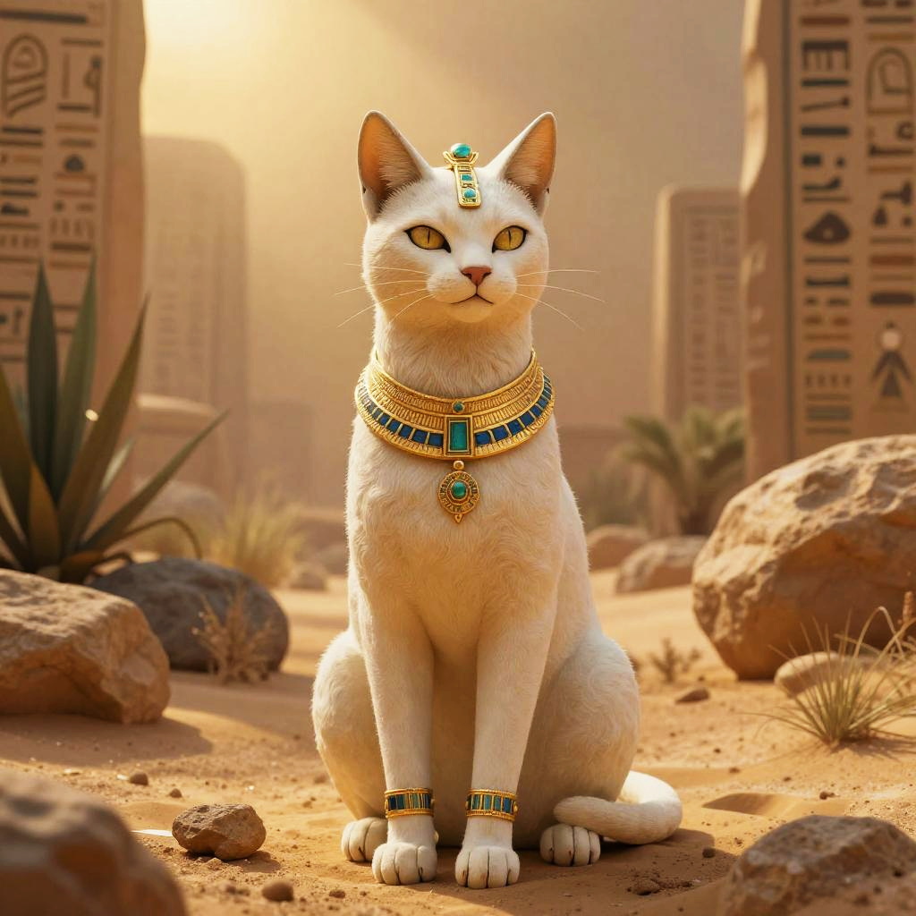 Digital artwork of an anthropomorphic black cat with glowing green eyes, wearing Egyptian gold jewelry, set against a sunset with hieroglyphs and a sil