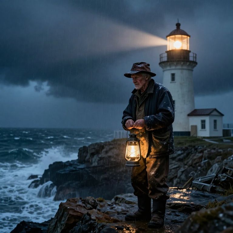 Craft a photorealistic portrait of an aged lighthouse keeper standing resolute on a rocky cliff, his weathered face illuminated by the beacon's solitary beam during a stormy night. The scene captures both the tempestuous ocean and the dramatic shadows cast upon it, evoking an emotional gradient that reflects resilience amidst melancholy. Wearing a worn leather hat pulled low against wind and rain, he clutches a lantern with gnarled hands while salt-encrusted clothing speaks to his enduring presence at this timeless structure. Bathed in warm light, the lighthouse stands firm against gathering dark storm clouds, capturing solitude and steadfastness in nature's fury. This image inspires reverence for the keeper's unwavering dedication as a guiding beacon through treacherous waters.