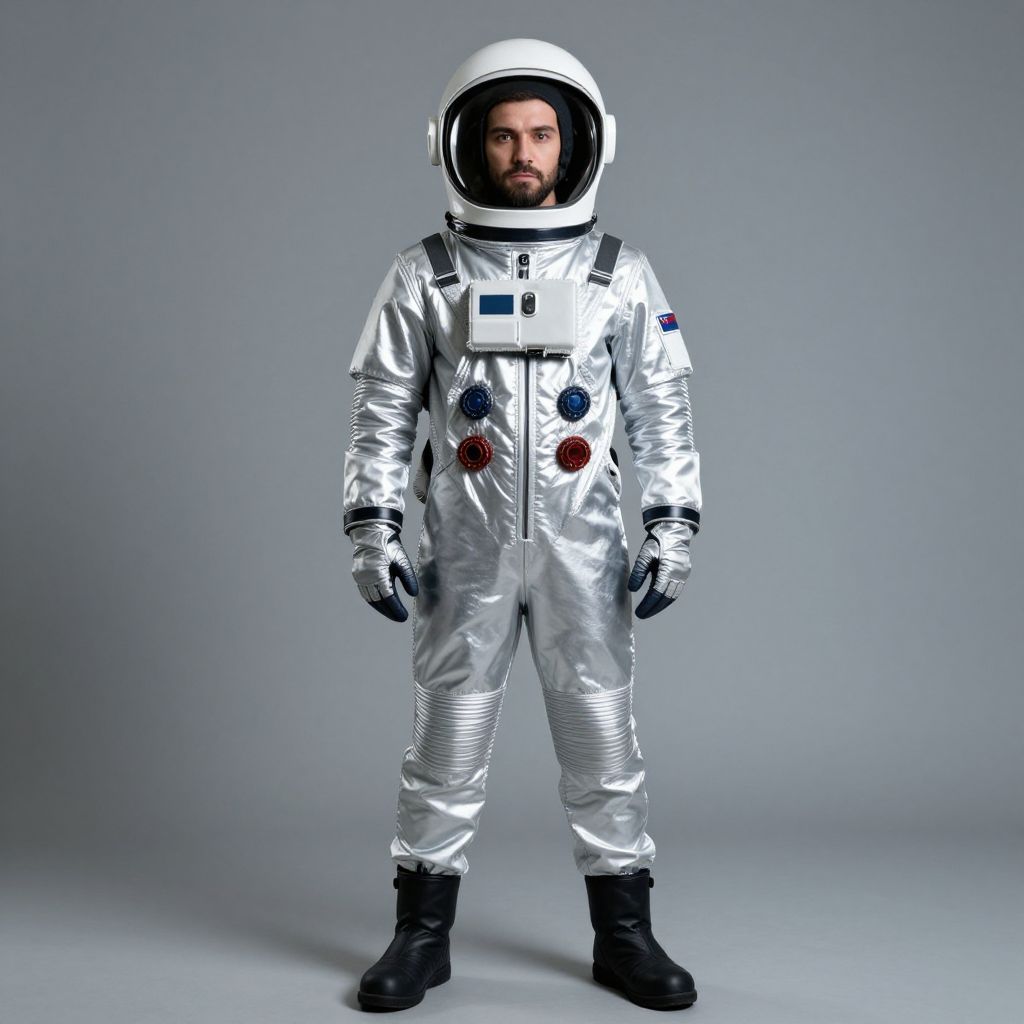 Photograph of a bearded man standing against a plain gray background, wearing a full silver astronaut suit with a white helmet and black boots. The suit features multiple colorful circular patches on the chest and black straps on the shoulders. The man's expression is serious, and the suit has a glossy, reflective texture. The lighting is even, highlighting the metallic sheen of the suit. The man stands centrally, facing forward, with his arms slightly relaxed at his sides. The overall composition is simple and focused on the astronaut suit.
