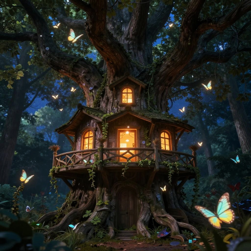 Fantasy forest cabin built inside a gigantic ancient tree, windows glowing warmly, surrounded by fluttering luminescent butterflies, enchanted vines wrapping the structure under a starry sky