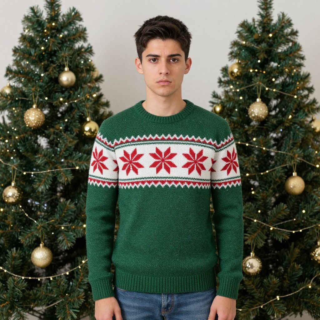 Photograph of a young man with short, dark hair and a serious expression, standing in front of two decorated Christmas trees. He's wearing a green knit sweater with white and red snowflake patterns across the chest and sleeves, paired with blue jeans. The background is softly lit, showcasing gold Christmas ornaments on the trees. He looks directly at the camera, centered in the frame.