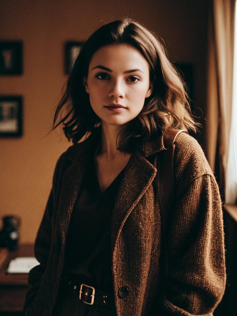 Portrait of a young woman with light skin and long wavy brown hair wearing a brown textured coat and brown shirt, standing near a window with warm, soft lighting. The image has a cinematic, warm aesthetic.