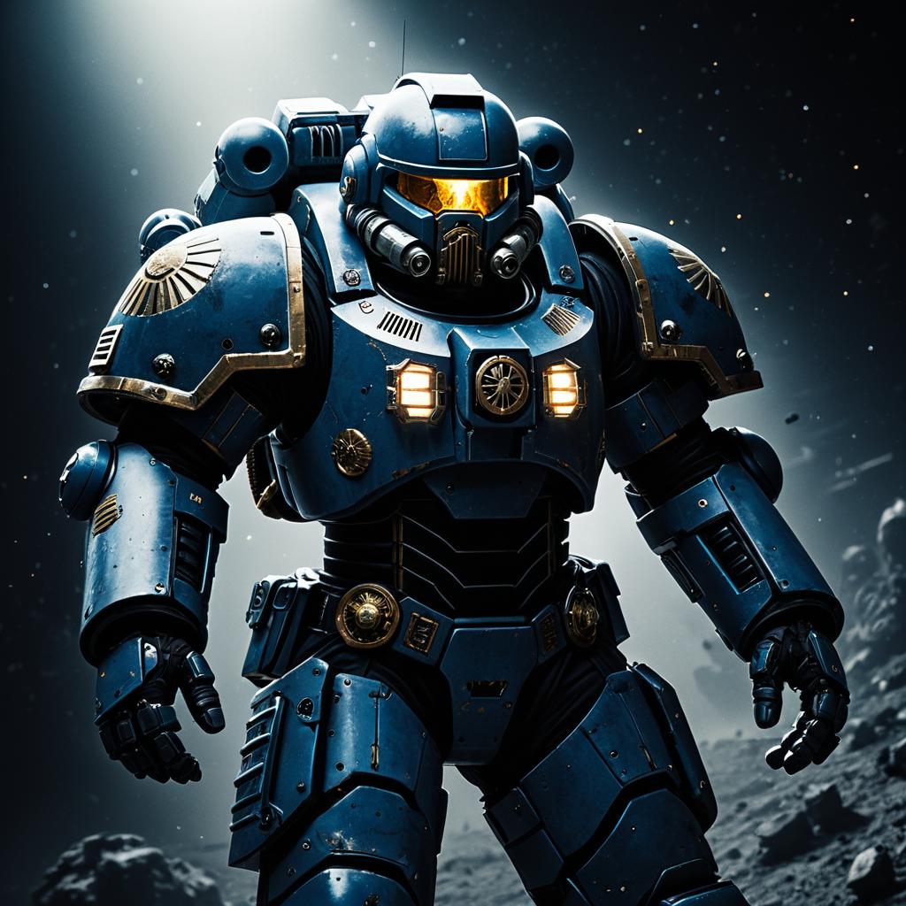 Conceptual art of a space marine wearing a detailed powered exosuit with futuristic armor, illuminated by harsh directional lighting. The armored suit features mechanical and sci-fi elements including a closed helmet with a blue visor and gold accents. The background depicts a high-tech circular corridor environment, enhancing the sci-fi atmosphere.