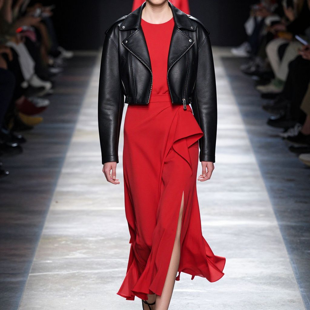 Stylish red dress with leather jacket, high fashion runway concept, sleek model walking under spotlight on glossy floor, bold colors contrasting black leather and vibrant red fabric, intricate detailing visible, dramatic shadows, modern elegance.