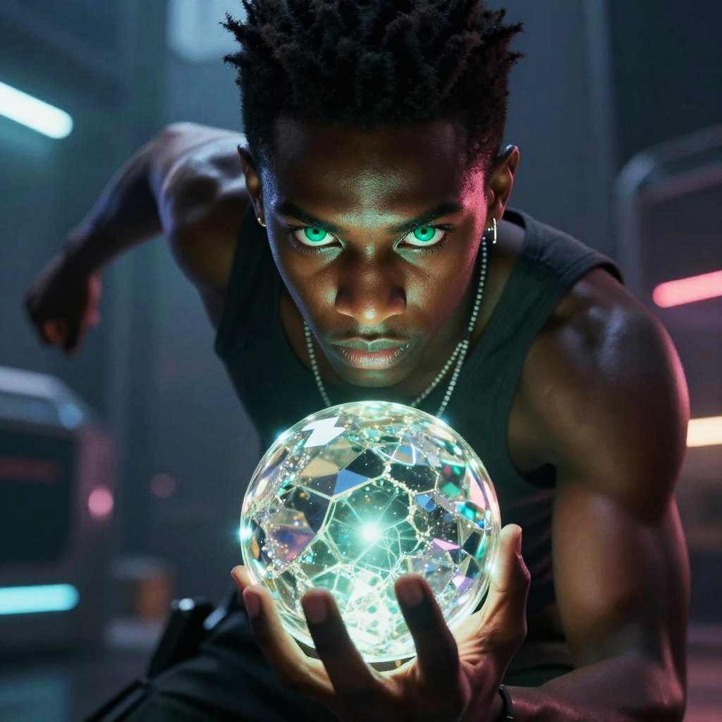 Photograph of a muscular black man with glowing green eyes, wearing a black sleeveless shirt and necklace, intensely holding a glowing, crystal-like orb in