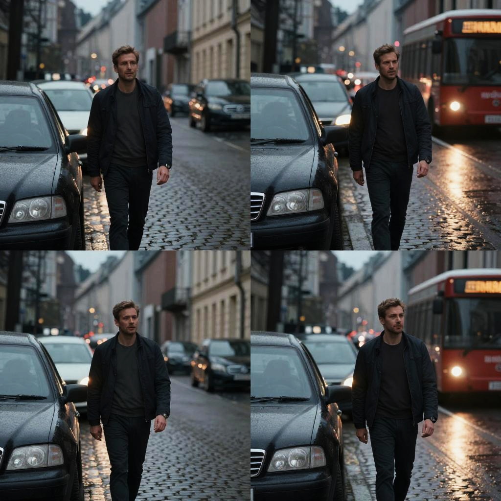 Photograph collage of a Caucasian man with short brown hair and a beard, wearing a dark jacket and black shirt, walking on a wet, cobblestone street in an urban area. The background features parked cars, a red double-decker bus, and illuminated streetlights. The man is positioned centrally in each frame, walking from left to right. The street reflects the lights, creating a shiny surface. The image has a slightly overcast, rainy ambiance, with grayish-blue sky and dim light. The man's expression is neutral, and he appears to be focused on his walk.