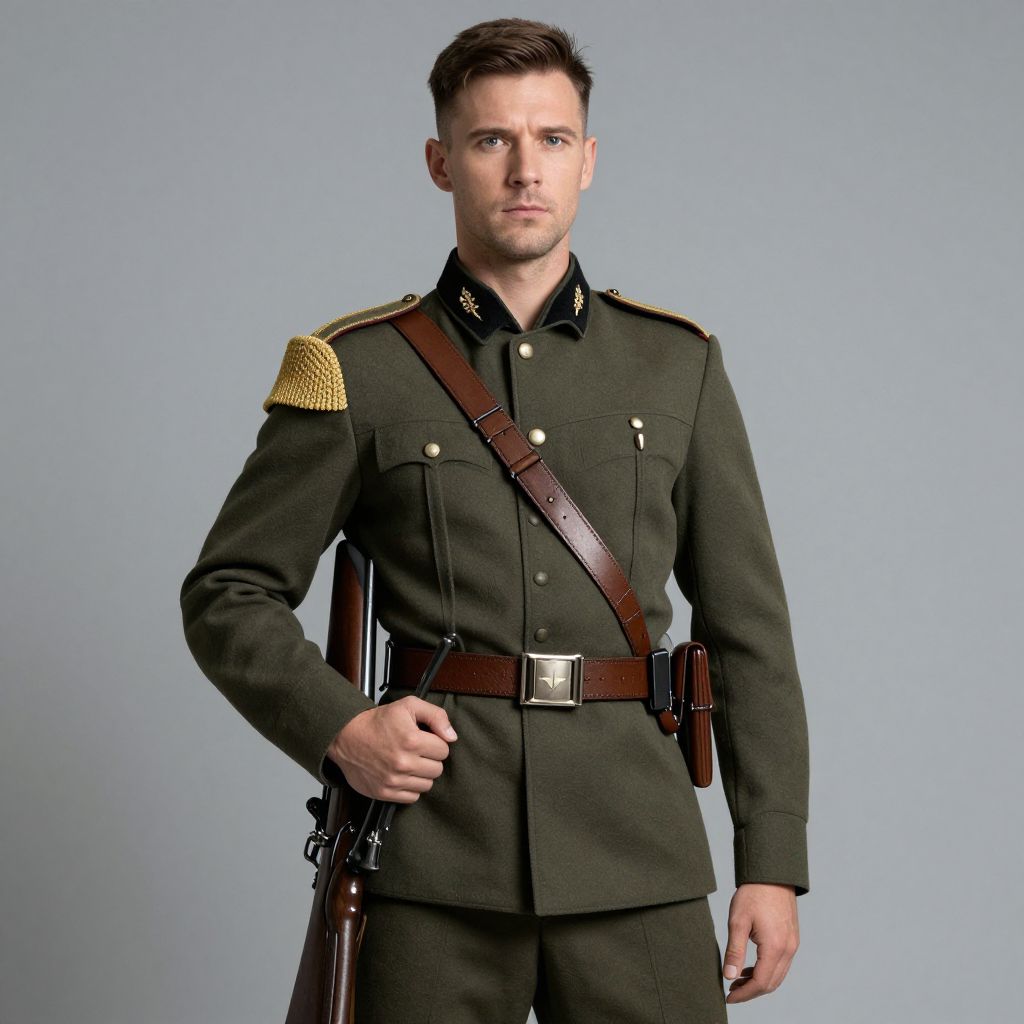 Photograph of a Caucasian man with short, dark brown hair and light skin, wearing a dark green military uniform with gold epaulettes and brown leather straps across his chest. He holds the stock of a rifle with his right hand. The uniform has a black collar and silver buttons, with a brown belt featuring a square buckle. The background is a plain, light gray. His expression is serious, and he stands against a simple, studio-style backdrop. The image is well-lit, highlighting the uniform's details and textures.