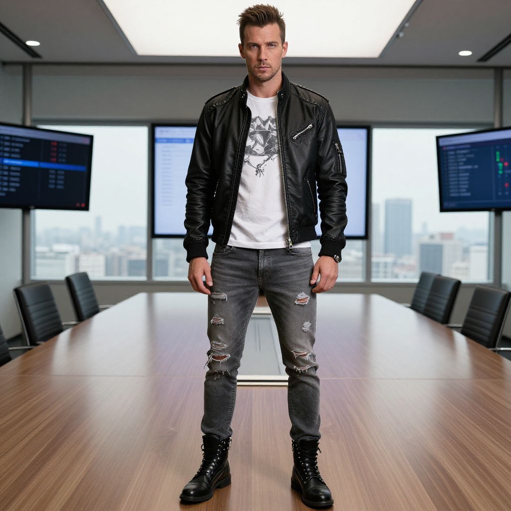 Photograph of a muscular, Caucasian man with short, styled brown hair and a trimmed beard, standing confidently in a modern conference room. He wears a black leather jacket over a white graphic t-shirt, distressed dark jeans with ripped knees, and black lace-up boots. The background features large windows with a cityscape view, two flat-screen monitors on the walls, and a long, wooden conference table with black chairs on either side. The room is brightly lit with a white ceiling light. The man's stance is relaxed yet assertive, with his hands by his sides.