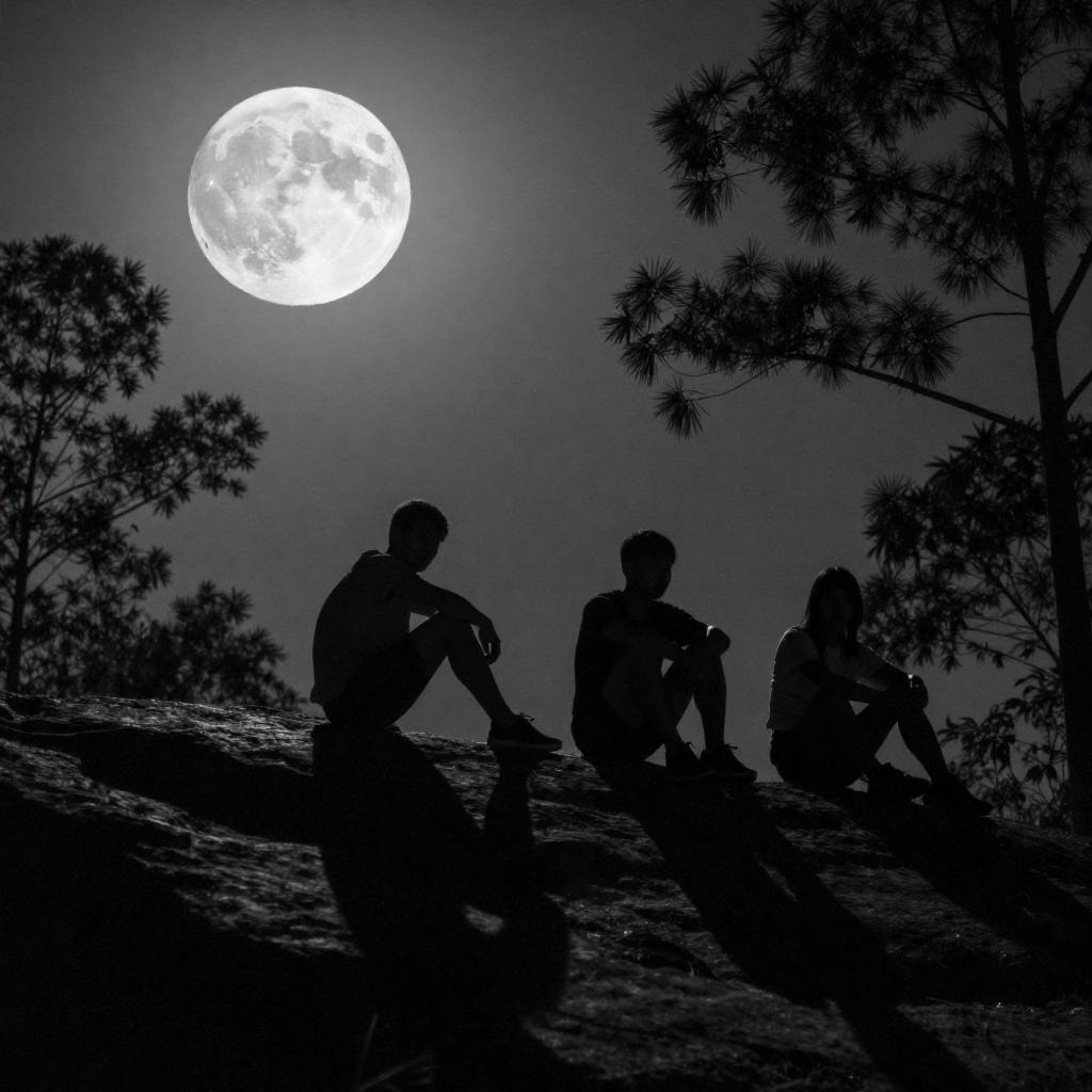 Black-and-white photograph of three people sitting on a rocky hill under a large, bright full moon. They are silhouetted, with one person leaning forward, another sitting with legs crossed, and the third partially reclined. Tall trees surround them. Intense moonlight casts strong shadows.