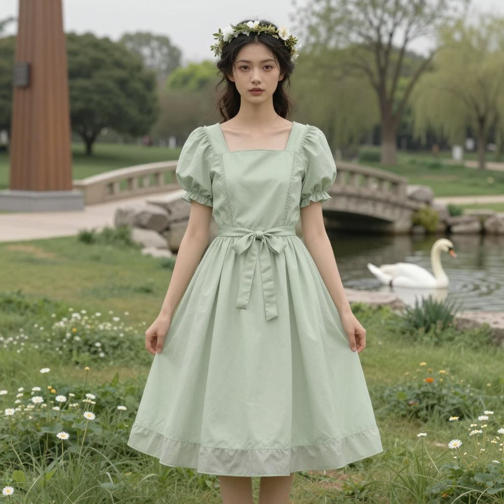 Woman in a light green dress with puffed sleeves and a ribbon tied at the waist, standing in a grassy park. Her dark hair is tied back with a floral crown. A stone bridge and a swan on a pond are in the background. A large wooden monument is on the left. Overcast lighting. She has a neutral expression. One swan in the pond. Green grass and small white flowers in the foreground.