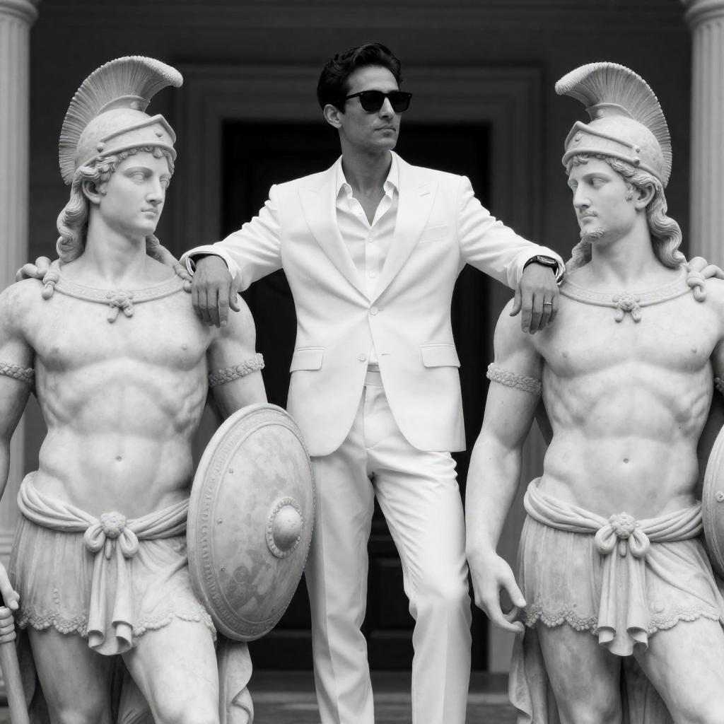 Black-and-white photograph of a man in a white suit and sunglasses standing behind three classical-style statues, including a muscular warrior with a shield and a helmeted figure. The man's pose is confident, with his hands on the statues' shoulders. The background features a dark, blurred interior with columns.