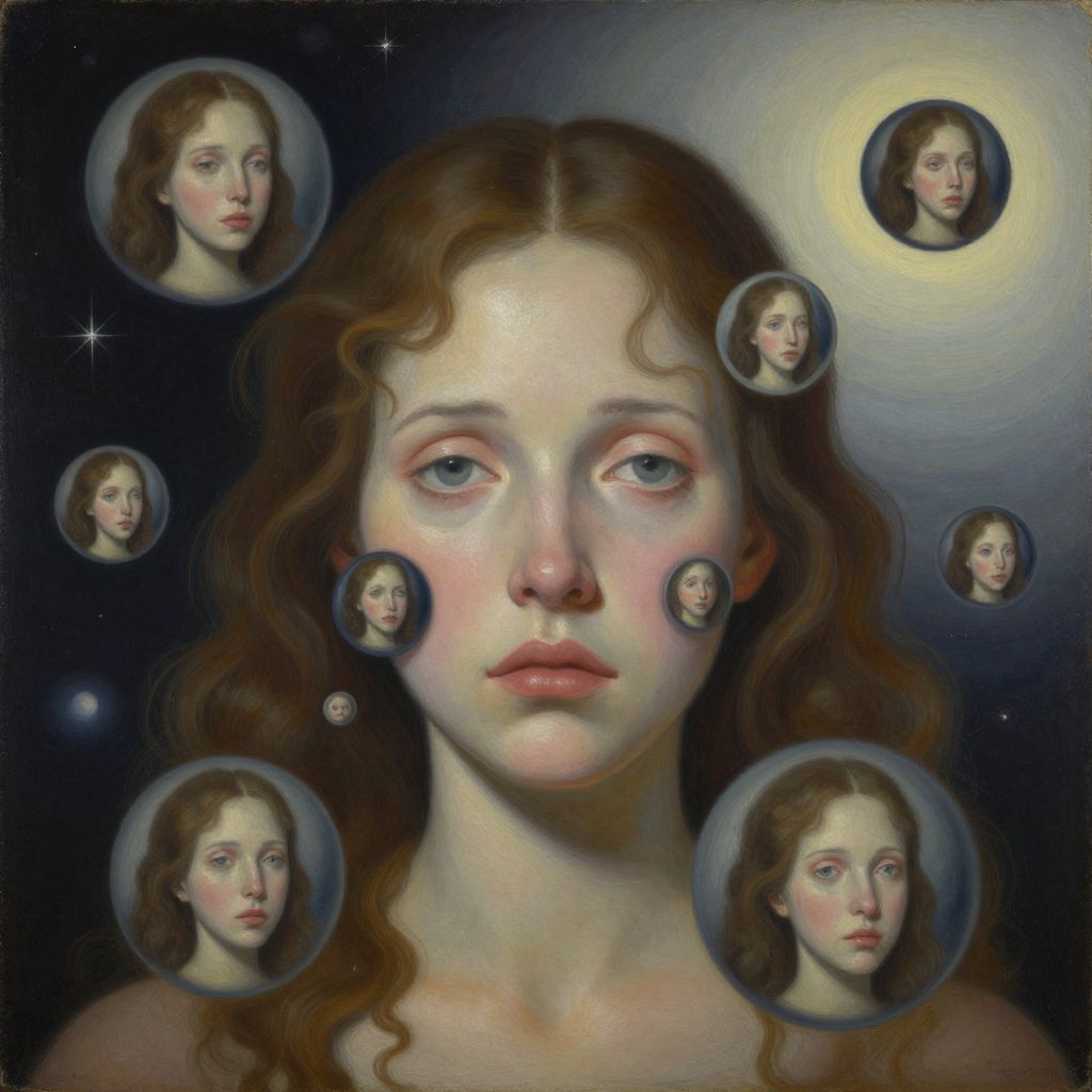 Digital painting of a pale, blue-eyed girl with wavy brown hair, surrounded by multiple circular portraits of herself, against a dark, starry background