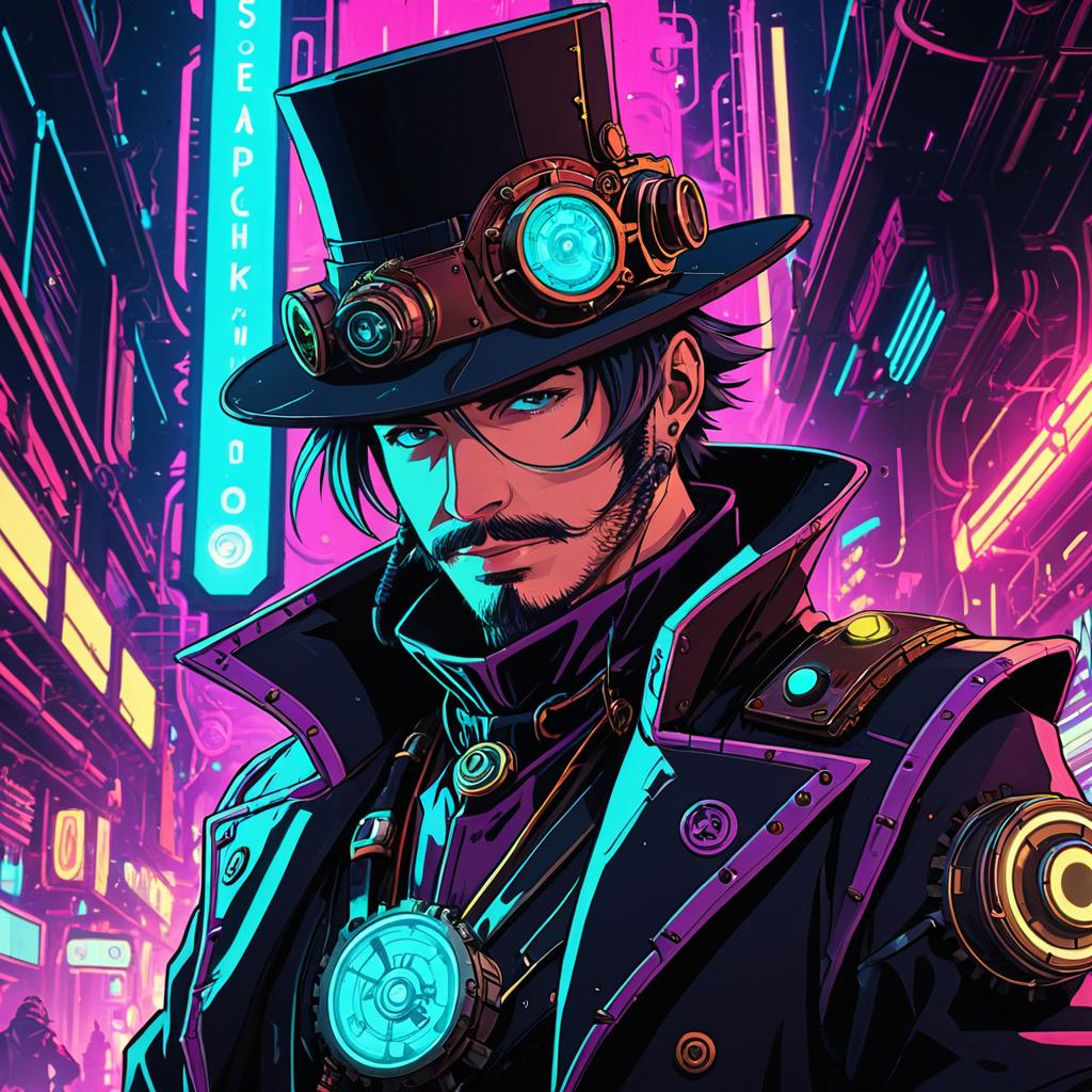 Cel-shaded portrait of ancient steam-powered mech pilot in neon noir synthwave cityscape, concept art by Josan Gonzalez and Wlop, highly detailed, sharp focus, trending on ArtStation, HQ