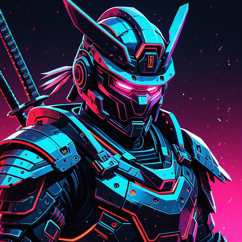 Highly detailed cel-shaded portrait of a futuristic steam-powered mech pilot wearing advanced helmet and armor in a neon-lit noir synthwave city. The pilot's helmet features glowing pink visors and intricate tubing. The background showcases a vibrant urban environment with illuminated skyscrapers and signage, inspired by synthwave aesthetics.