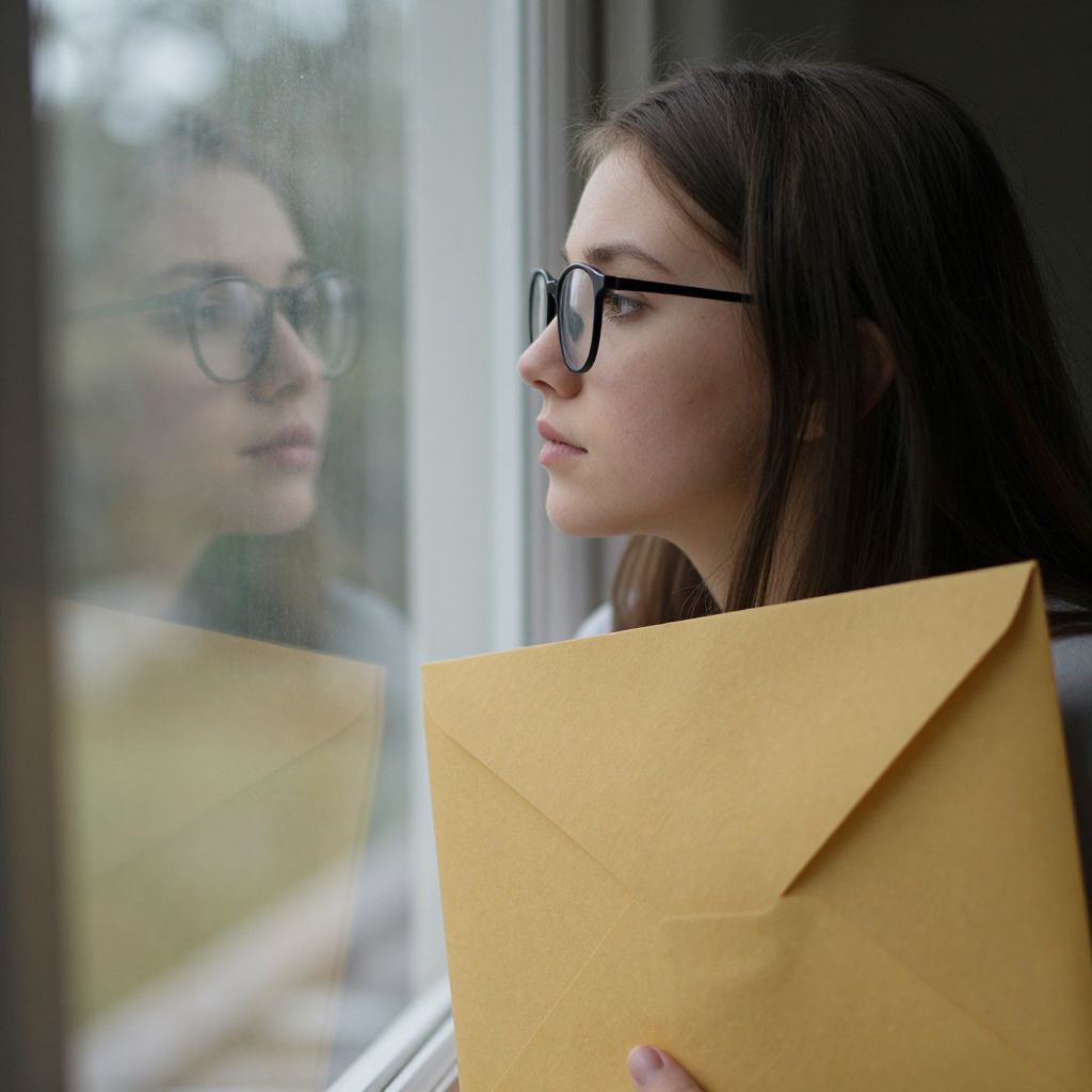 Enveloped in the soft hum of solitude, a woman with glasses gazes out the window, her reflection mirroring the quiet contemplation of dreams deferred yet still alive.
