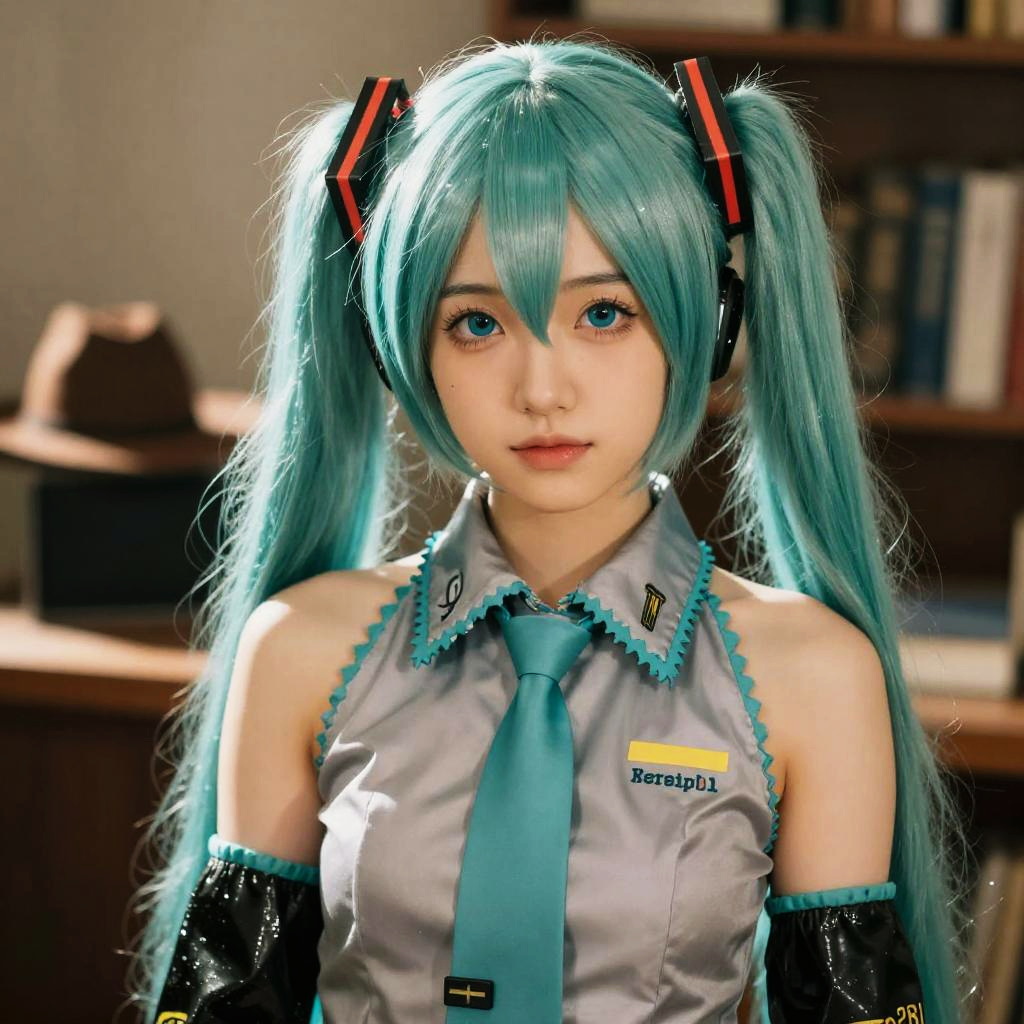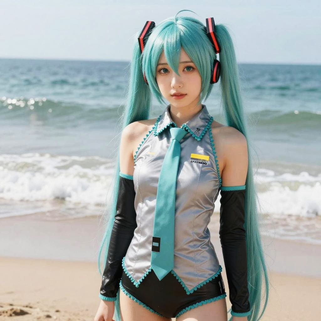Digital art, realistic, upper body, swimsuit, hatsune miku on the beach, looking at viewer, outdoors, on the beach, waves, masterpiece, best quality