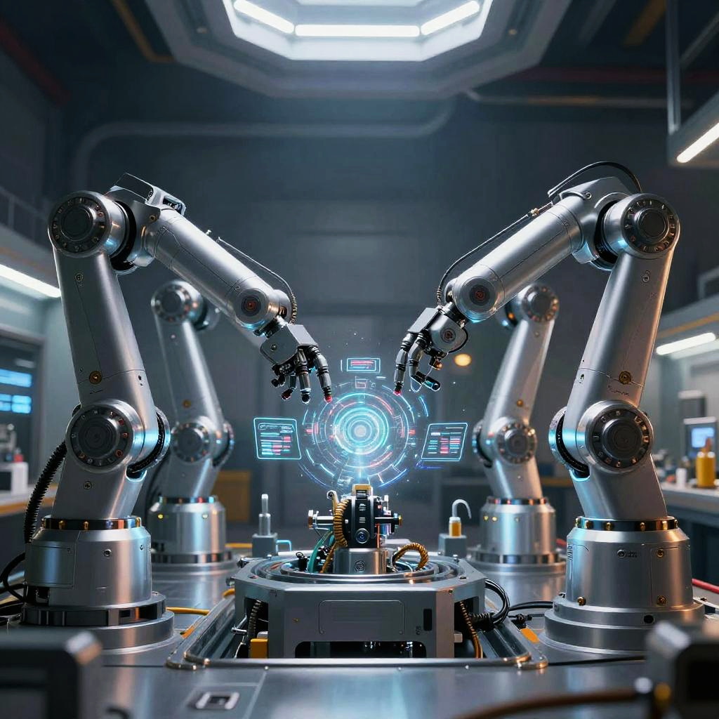 A tangle of futuristic robotic arms assembling intricate machinery in a high-tech lab, sleek chrome surfaces with holographic interfaces, cinematic lighting with strong shadows and highlights, sci-fi industrial setting.