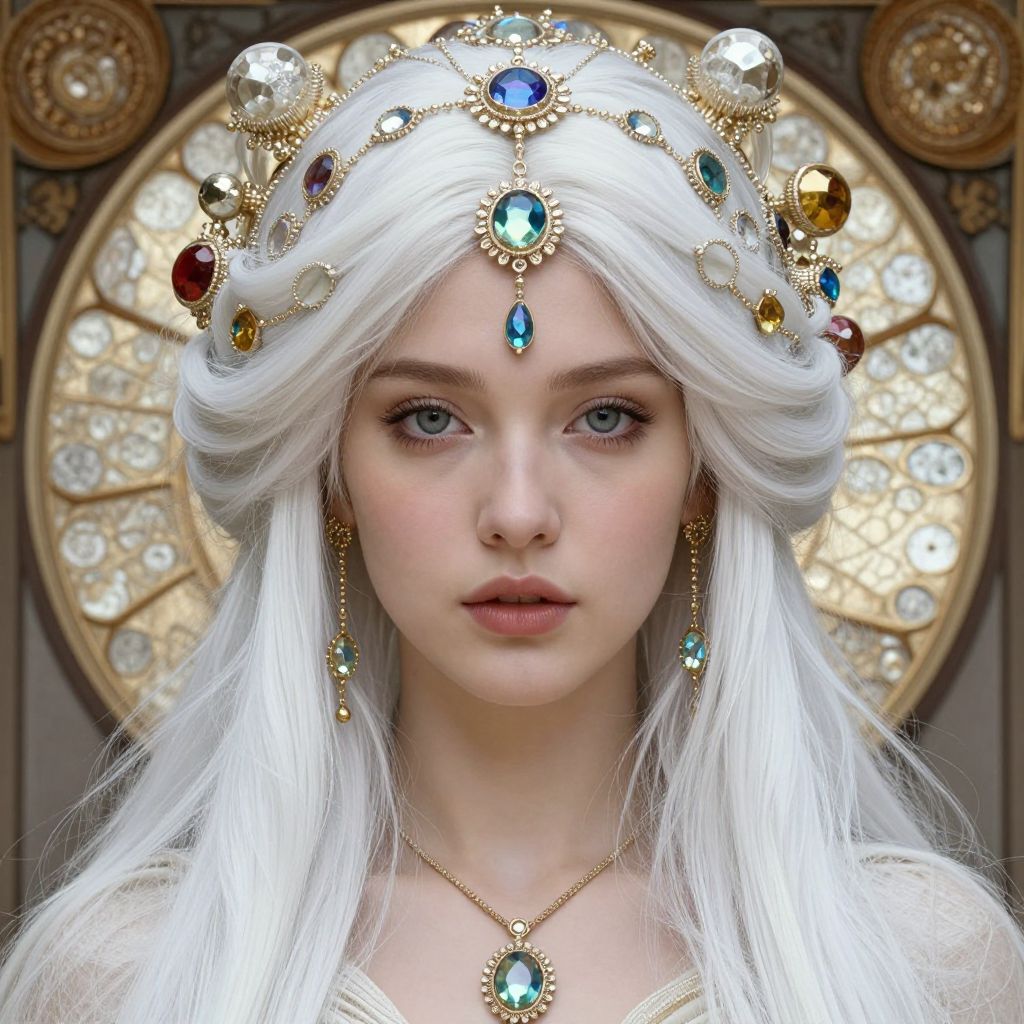 Photorealistic digital art of a golden-skinned, blonde woman with wavy hair, adorned with blue gemstones, wearing a blue gemstone necklace