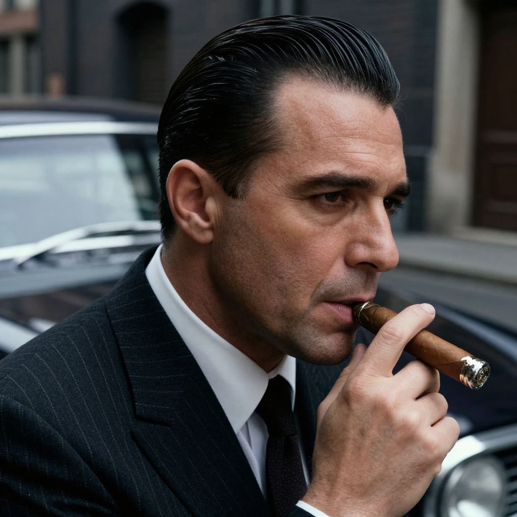 Close-up of a mafia slick back hairstyle on a confident man with a chiseled jawline, dressed in a pinstripe suit, holding a vintage cigar, against a backdrop of classic cars and dark alleyways, moody lighting.