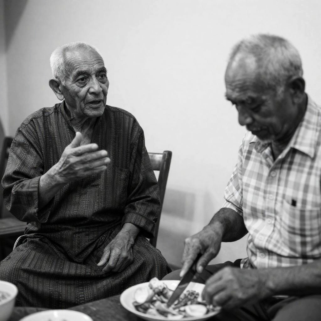 Black and white photograph of an elderly man in a hat and glasses holding a cane, leaning against a rough concrete pillar. A second elderly man with a bald head stands behind him. Dark, blurred background. Both men have intense expressions.