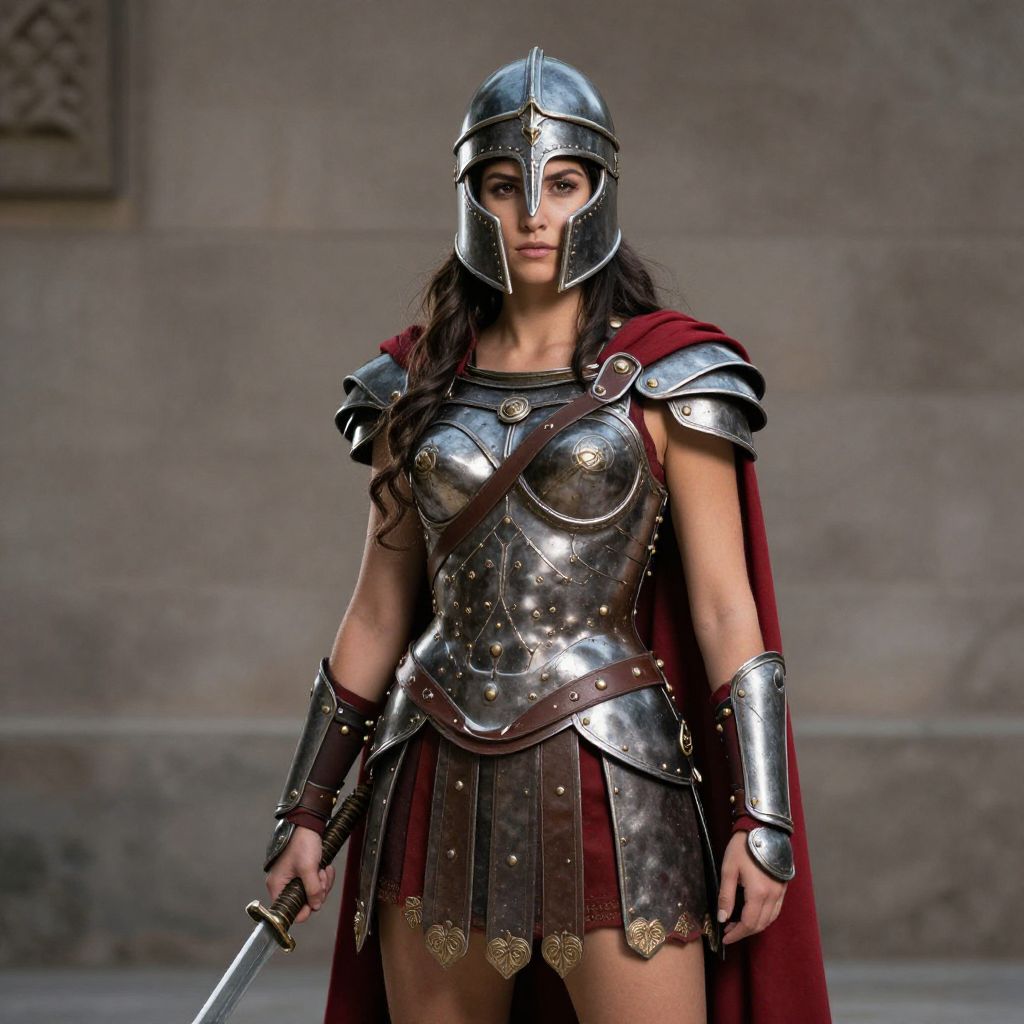Photorealistic CGI of a fierce, young woman in medieval Roman-style armor with a red cape, helmet, and sword, standing against a stone wall