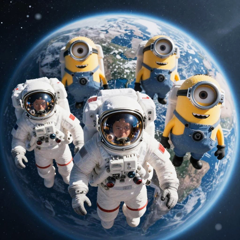 Russian minions in cosmonaut suits floating in space with Earth covered in snow behind them, epic sci-fi scene, hyper-realistic rendering